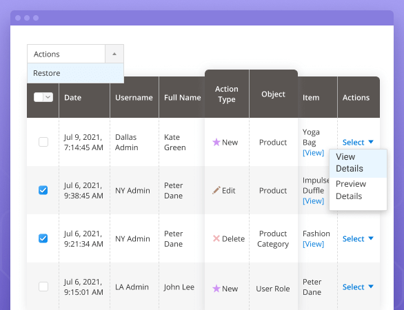 In case one of store administrators performed incorrect actions, you can easily restore recent changes to always keep your website data clean.