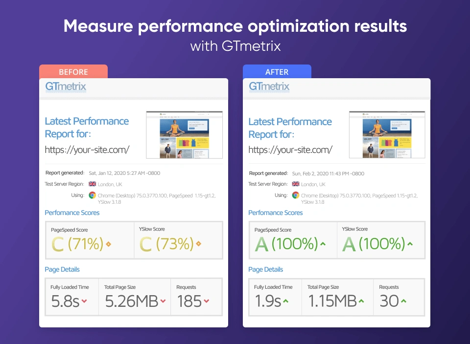 - An increase in the GTmetrix PageSpeed score from 65% to 98%.