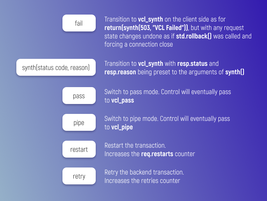 Note: VCL doesn’t contain any loops or jump statements. For a complete documentation of the VCL syntax, please, follow the link.