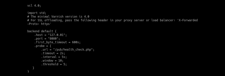 From the Caching Application list, choose Varnish Cache. Enter a value in the TTL for public content field, expand the Varnish Configuration setting and enter the next information: