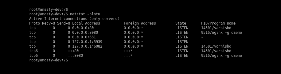 Varnish is preset to use port 6081 for public accesses and port 6082 for the admin web interface by default. To check the default conditions use this netstat command: