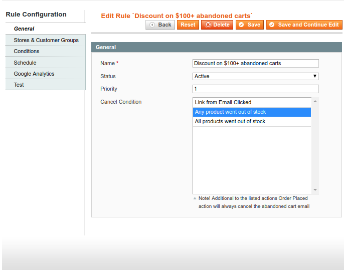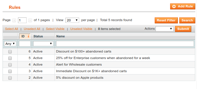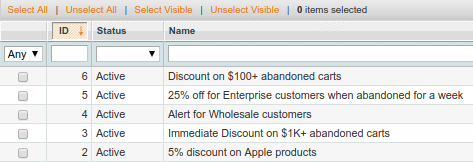 To create a new rule for abandoned cart emails, go to Promotions > Abandoned Cart Emails > Rules