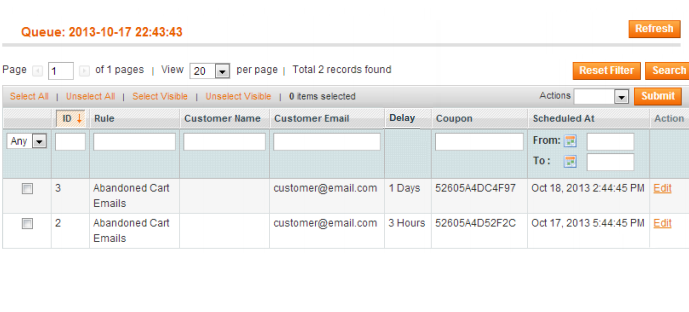 On the queue grid, you can see all emails that are waiting to be sent. You can also see the scheduled sending time and the coupon code.
