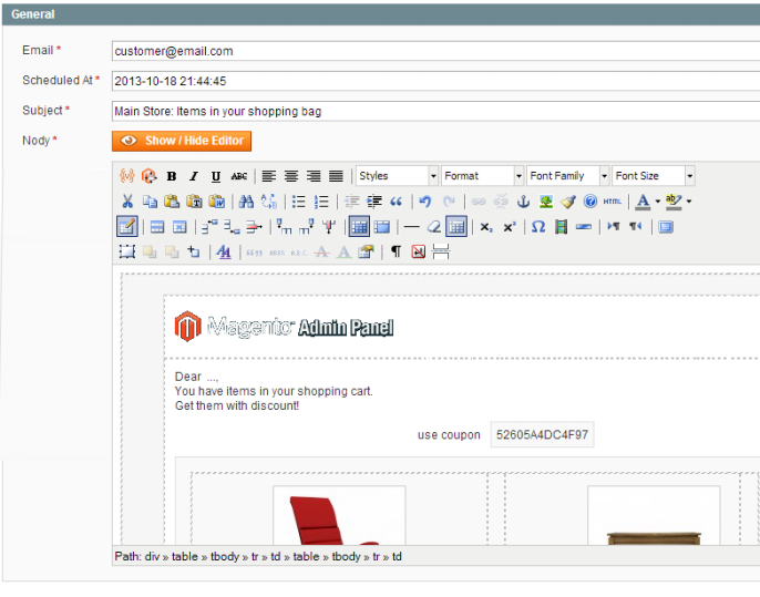 Coupon - choose a coupon type, a date of its expiration, a discount amount and a cart subtotal for each particular email.