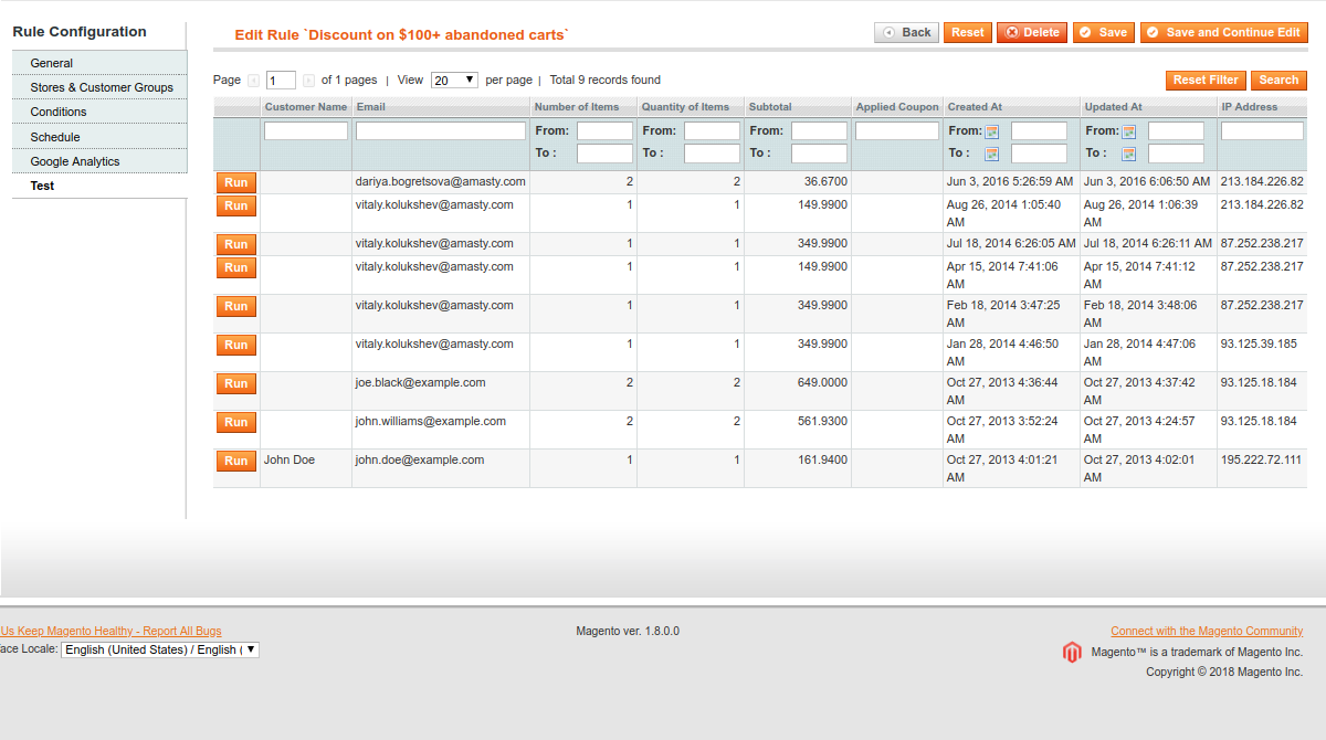 Test emails work only for registered users. When a customer adds some items to the cart and then leaves it without making a purchase, his/her email address gets to the test grid.