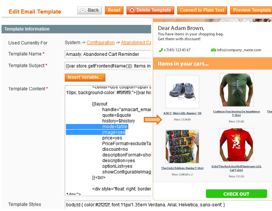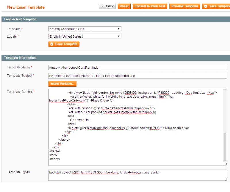Then hit “Load Template” button. Name the template and edit the code if necessary, then save the template and then it will be available to use in the corresponding rule. Now you can use any templates created in ‘Transactional e’mails’ section for abandoned cart e-mails.