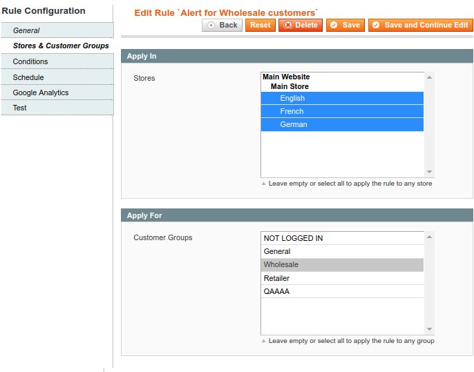 Specify the store view and customer groups to which the rule should be applied.