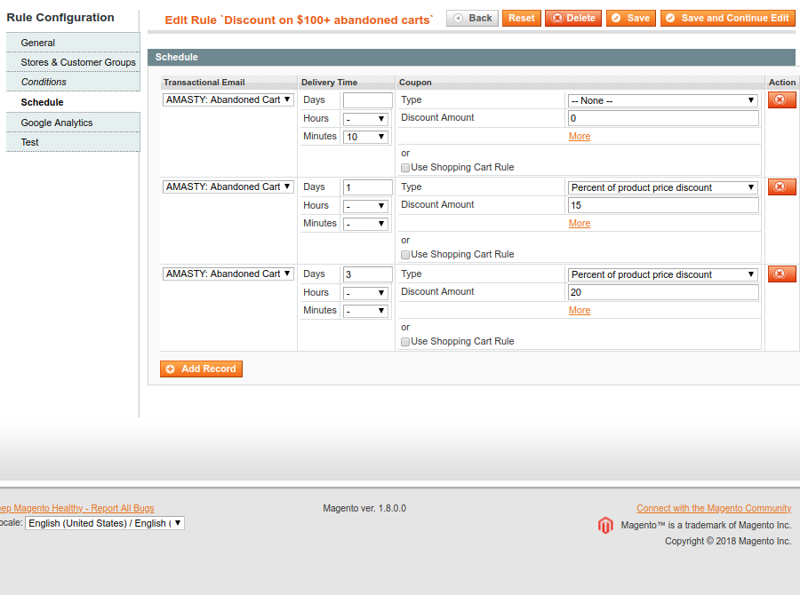 Delivery Time - set the time intervals after which the cart will be considered abandoned and the email reminder will be sent to a customer.