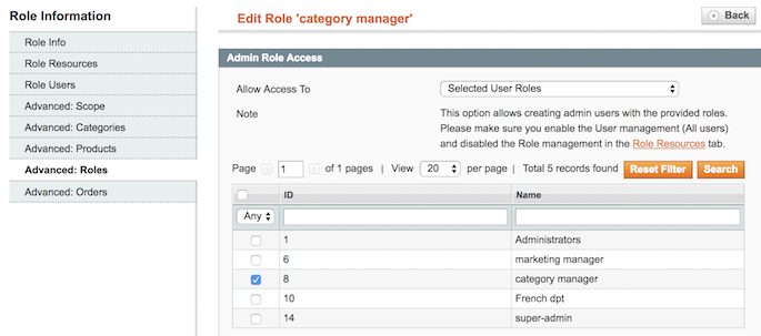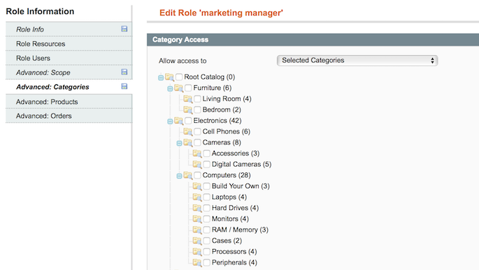 Distribute permissions for the backend users to provide them with limited access to products, categories, store views, and websites editing. Separate duties between the admin users of your store. Set specific roles for vendors, category managers, etc.
