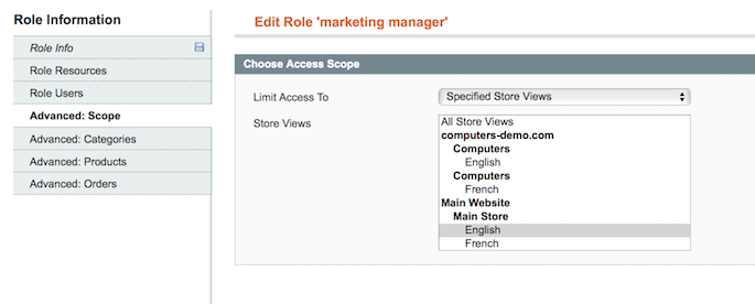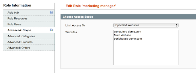 At the Advanced Permissions: Scope tab you can specify website or store view the sub-admin will have the access to. Choose Store View or Website from the Limit Access To dropdown and select particular store views or websites below.