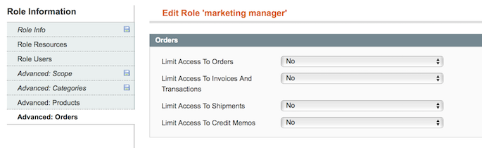 At the Advanced Permissions: Orders tab you can limit the access to various order related information for users under this role. Enable the corresponding option to use limitations.