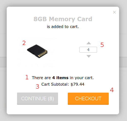 It is possible to select what product information you would like to display in the cart dialog window. Show the number of products in cart, current cart subtotal and the name of the product which is being added to cart: