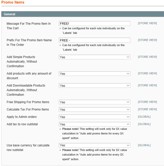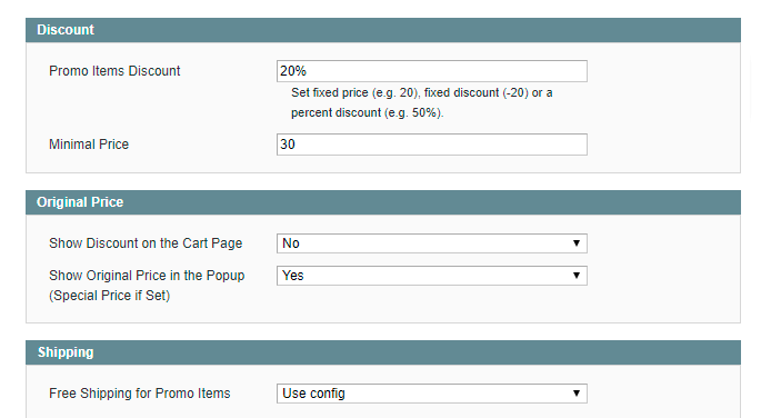 Free Shipping for Promo Items - Set either free shipping or paid shipping for the promo items. If you choose the ‘Config’ option – the default shipping settings will be applied.