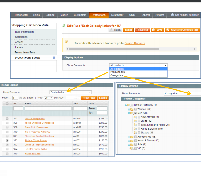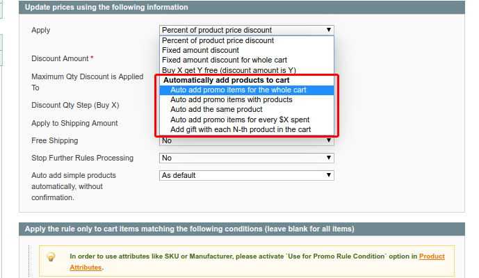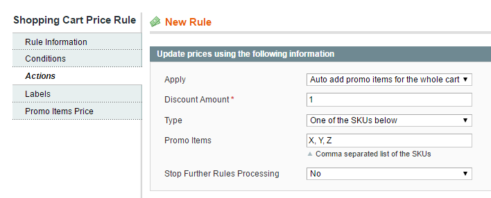 Type - Set ‘All SKU’s below’ to automatically add to cart all promo items. Set ‘One of the SKUs below’ to let customers choose one of the available promo items specified in the field below. With the actions “Auto add promo items for the whole cart” and “Auto add promo items with products” you can choose whether to add all the products with specified SKUs automatically or let customers select only one free product.
