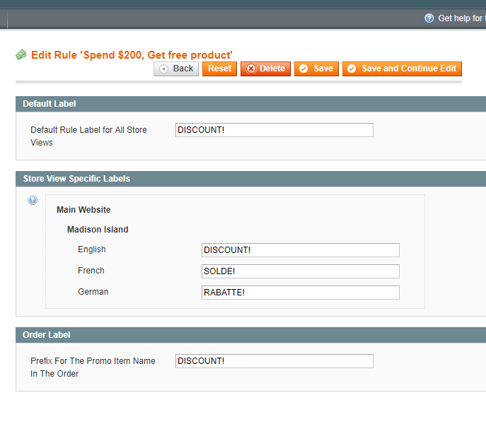 At the ‘Labels’ tab you can specify the promo text which will be displayed in the shopping cart and on the backend order page when the rule gets applied.