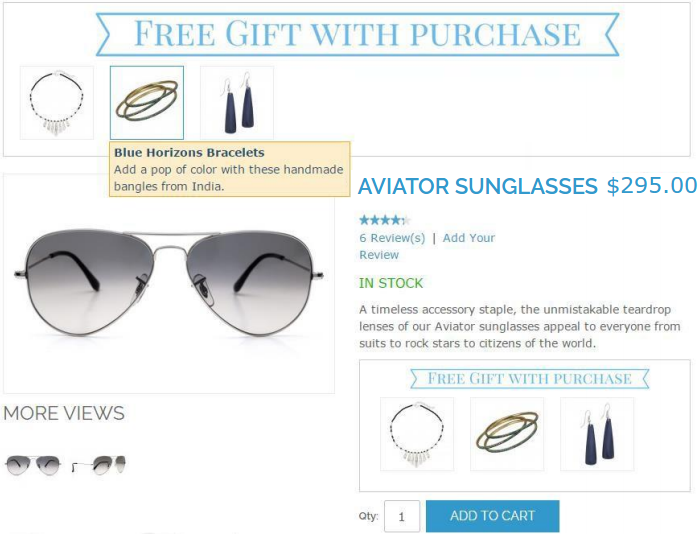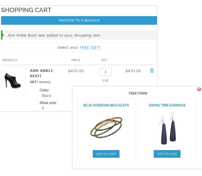 Once the customer clicks on the Free Gift link, the pop-up with free items appears. If you enable ‘One of the SKUs’ option, a customer will be able to select a free gift.
