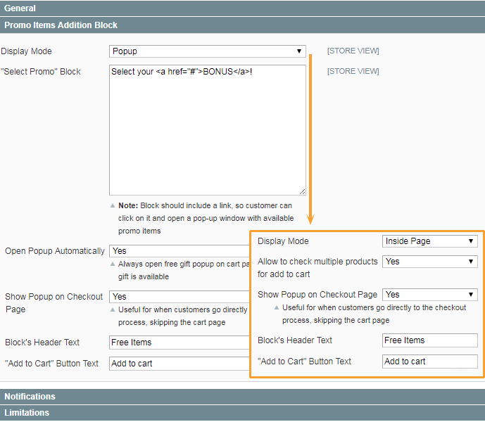 Display Mode - Choose where to display free gifts: either in the popup or in the shopping cart page block.