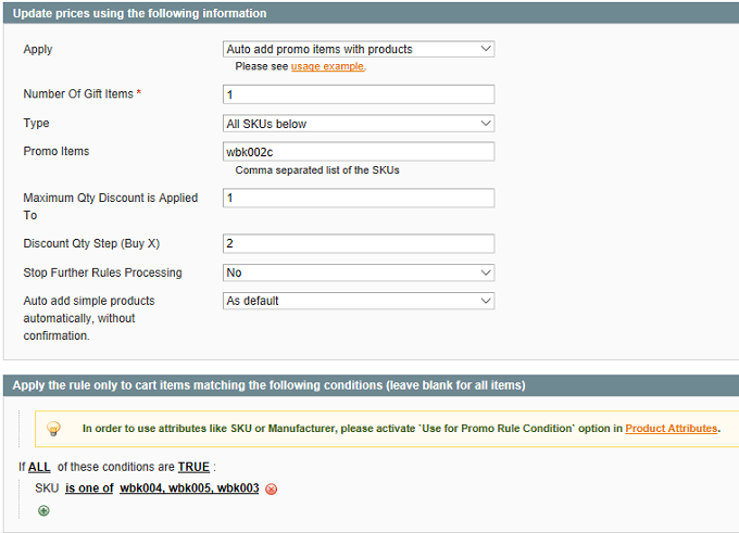 Type - set ‘All SKU’s below’ to add all gift items automatically or ‘One of the SKUs below’ to let customers choose one of the available gifts specified in the field below.