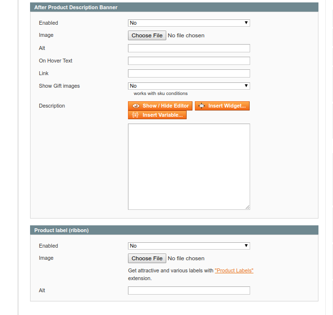 The settings for ‘After Product Description Banner' display are similar to the ‘Top Banner’ settings. This banner will be displayed in the product options block above ‘Add to Cart’ button. Add a promo “Label” to the item’s photo if you want to highlight a promo product.