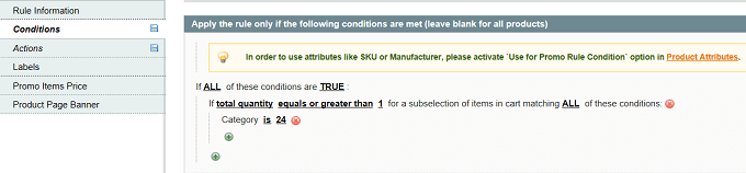 Use the conditions block to specify items to which the rule should be applied. According to the example above, a free camera case will be automatically added to the cart for each product from the ‘Digital Cameras’ category. For example, if a customer adds two cameras to the cart, he or she will get two free camera cases.