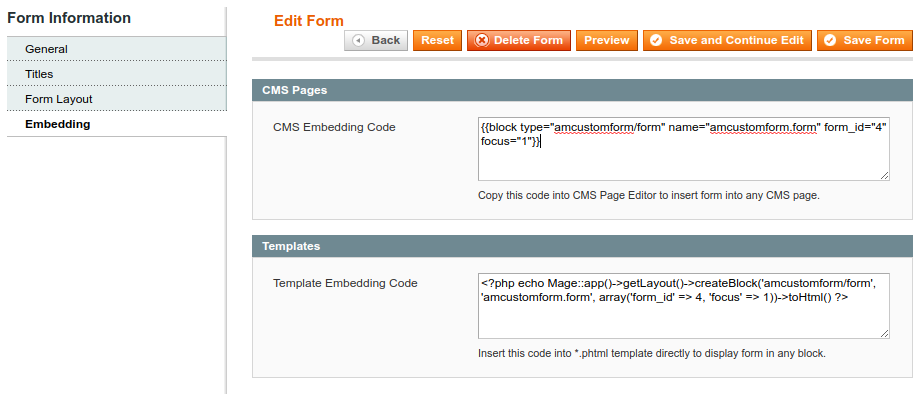 CMS Embedding Code - Use the code to add your newly created form to CMS.