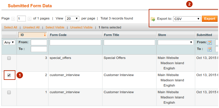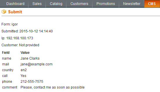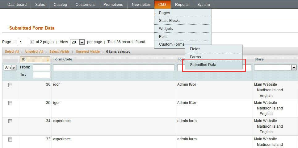 To view saved data of custom forms go to Admin Panel → CMS → Custom Forms → Submitted Data