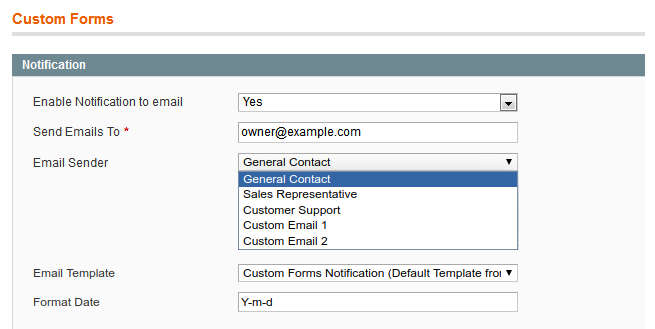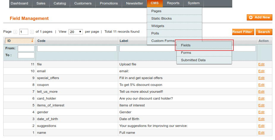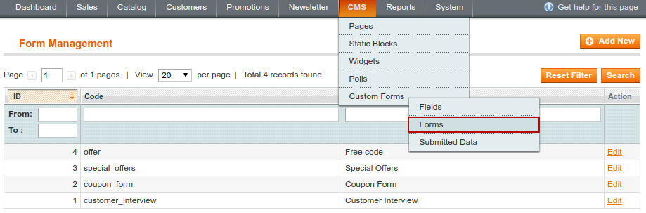 To create new forms or edit already existing ones, go to Admin Panel → CMS → Custom Fields → Forms