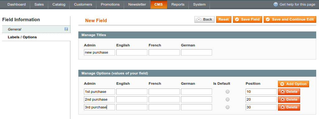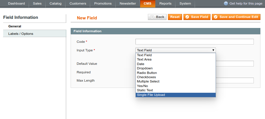 To configure and create custom Forms, Fields or Submitted Data, go to Admin Panel → CMS →Custom Forms →Fields