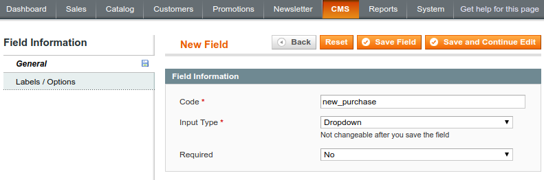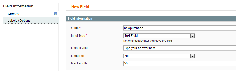 Input Type - Select a type of input for your form. Notice that it cannot be changed, after the field is saved.