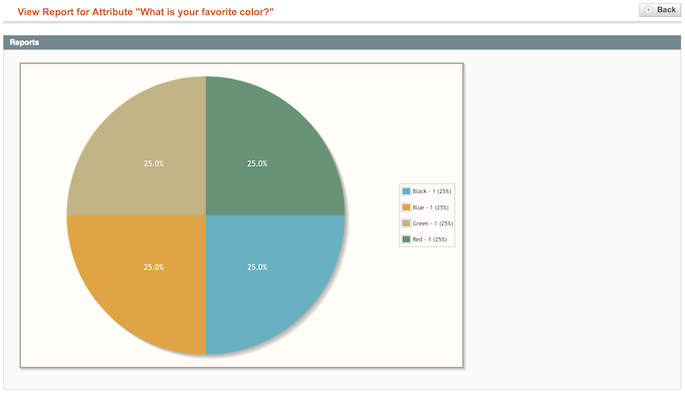 To see Customer Attributes Reports please go to Customers → Customer Attributes → Reports. Click on one of the attributes from the grid to see the report.