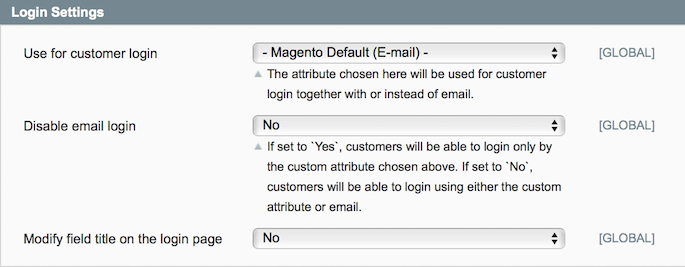 Disable email login — if you would like to use only the custom attribute for login (not in parallel with email), please set this option to Yes. If you set it to No customers will be able to login using either email or the custom attribute value (in combination with password);