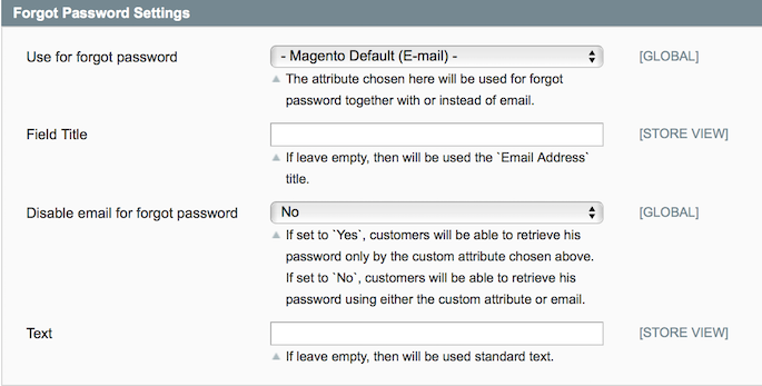 Disable email for forgot password — set this option to Yes and customers will be able to recover the password only with the specified attribute;