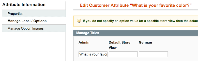 Then, switch to the Manage Label / Options tab. Here, you can indicate the attribute's title for the admin panel and different store views.