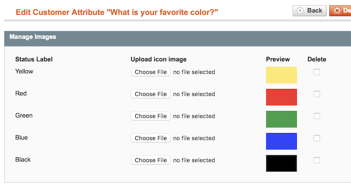 When you’ve indicated all the necessary options for Multiple Checkbox Select with Images (or Single Radio Select with Images) field type attribute, please press the Save and Continue Edit button. Manage Option Images tab should appear.