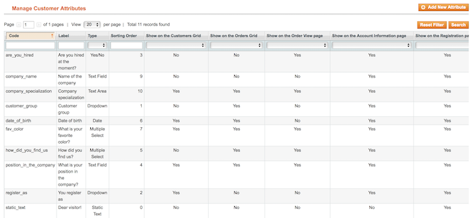 All created customer attributes are available on the attributes grid. Navigate to Customers → Manage Attributes to see the grid. Here, you can find attributes and their values.