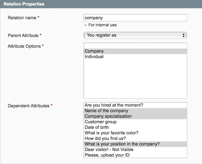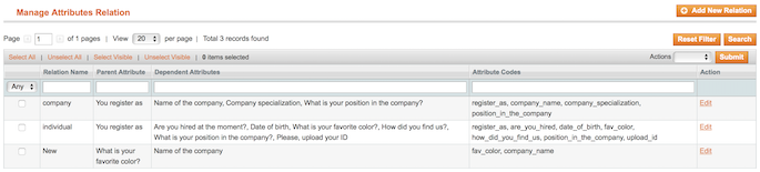 To create dependencies between attributes please go to Customers → Manage Attributes → Manage relations. To add a new relation please click the Add New Relation button.