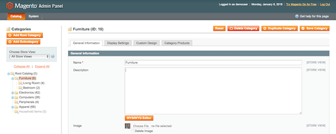 The module allows you to duplicate categories using the default Magento interface. Navigate to Catalog → Manage Categories. Then, select on of the existing categories and the Duplicate category button will appear.
