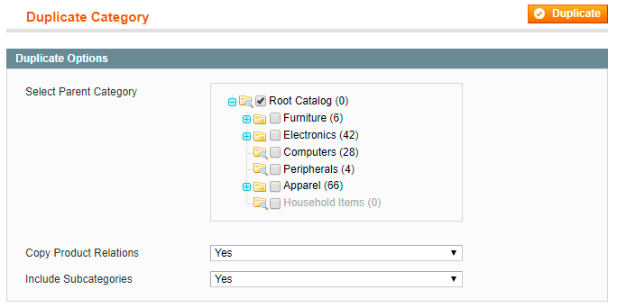Copy Product Relations — if Yes, all products from the existing category will be added to the duplicate automatically. If No, the items from the primary category will not appear in a duplicated one.