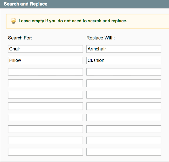 Words from the Search For fields will be replaced with content from the Replace With field.