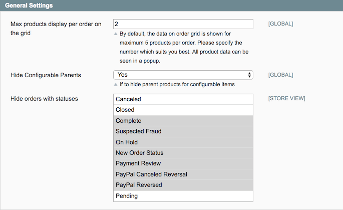 Hide Configurable Parents — choose Yes to hide configurable parent product's attributes from the order grid;