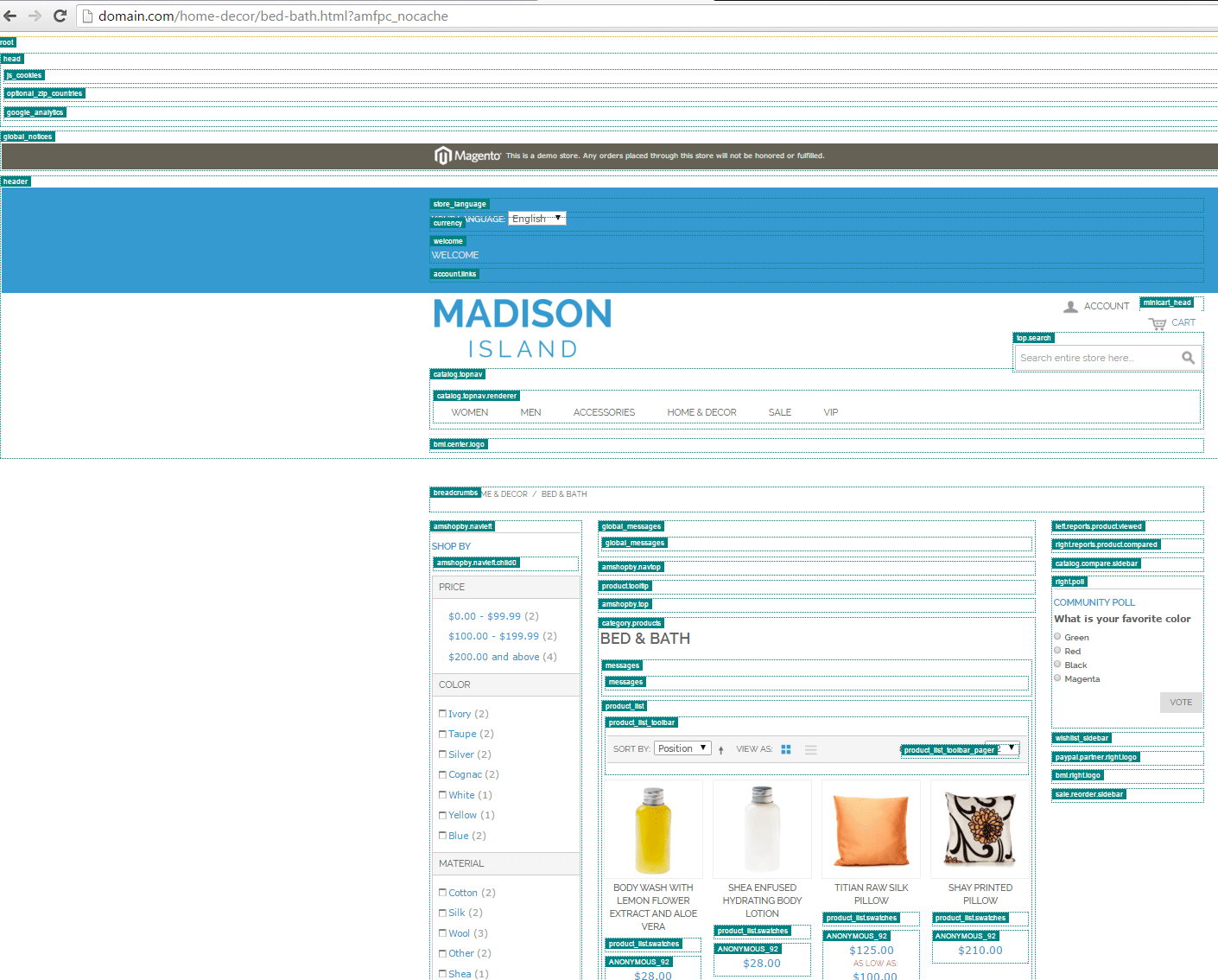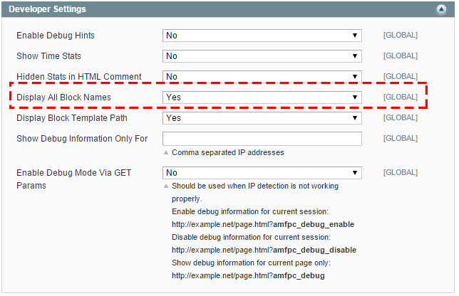 Display All Block Names - allows seeing all block names on the front end. The block names will be shown on the page where the status is equal to 'Cache Miss' or 'Contains ignored params'. If you have a page and want to show the hint but don't flush the cache just add the following parameter to the URL: ?amfpc_nocache