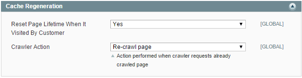 We recommend to set the cache lifetime reset capability to reset the cache lifetime when a customer or bot visits a page. This should help to store pages in the cache longer and decrease the server load. Also, the chance that a customer will visit a page without the cache decreases. This feature is enabled by default but you can make sure just in case you already modified the default settings: System → Configuration → Full Page Cache → Cache Regeneration, the Reset Page Lifetime When It Visited By Customer option should be set to Yes as well as the Crawler Action option to Regenerate Cache Lifetime.