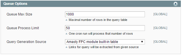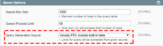 There are several options for crawler in the Full Page Cache extension. We recommend to use the default one: System → Configuration → Full Page Cache Crawler → Queue Options, where the Query Generation Source option should be set to Amasty FPC built-in table.
