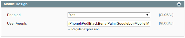 User Agents - available only when the option 'Enabled' has value 'Yes'. Includes all agents which will get a mobile version on page load. The agents listed in the field should be the same as agents listed at: System → Configuration → Design → Themes (if a custom theme is set via Magento native functionality).