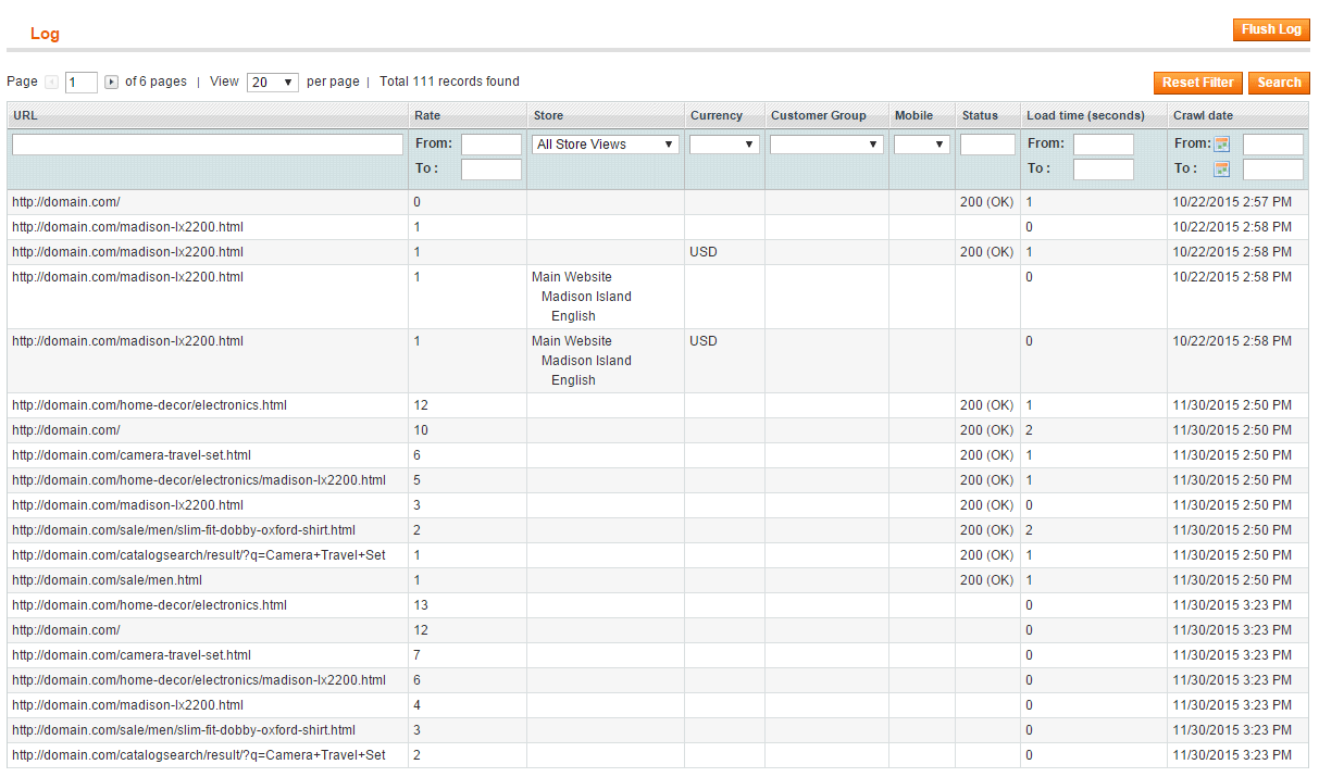 The log shows all the URLs which were crawled. The log contains all possible variants based on selected 'Pages Combinations' This is a table with vivid display of values from the logs table. You can make use of handy search by any parameter.