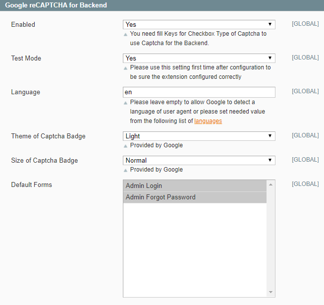 Test Mode — Select YES for the first time after configuration to be sure the extension configured correctly. If you don't turn on the Test Mode and enter wrong credits when logging in the admin pannel, the Captcha won't let you in the admin.