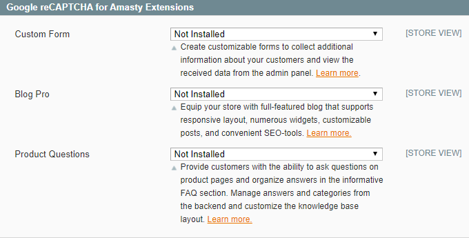 Here you can see the names of the supported modules: Custom Form, Blog Pro, Product Questions. If the module is installed, then you can enable or disable the Captcha for it. All required settings will be added automatically.