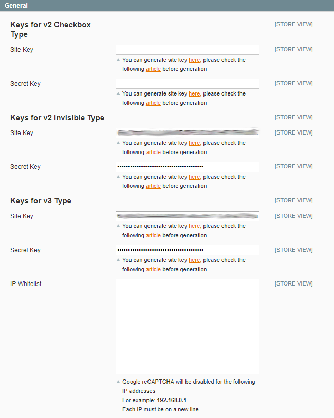 Site Key — fill in an individual site key generated for your store (they are different for Checkbox and Invisible Types of Captcha)