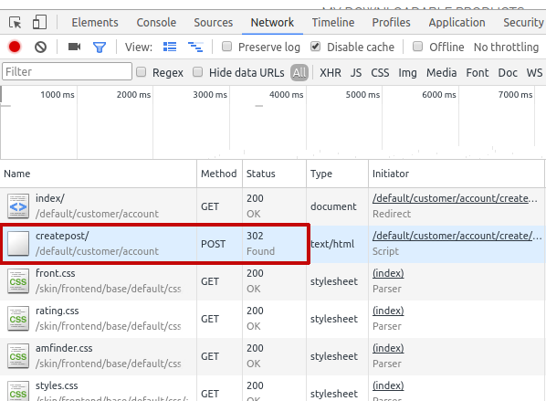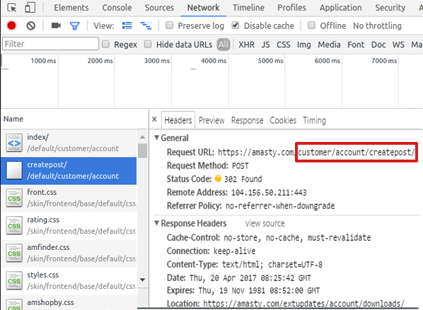 5. Click on this request and in the 'Headers' tab find a 'Request url'. Сopy the path from the url (in our example it is customer/account/createpost/).