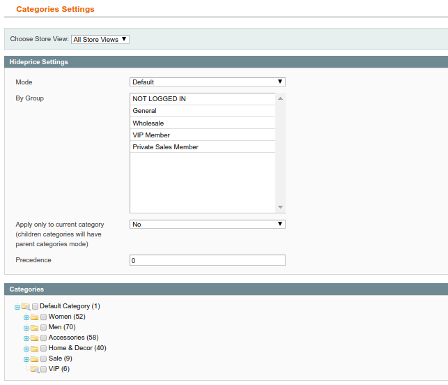 Precedence - In case any product is displayed on the page where no particular category for this product is defined (e.g. search page) or the item belongs to several categories with different Hide Price settings, the Precedence option can be used. With the option you can set which category Hide Price settings will be applied to the products primarily.